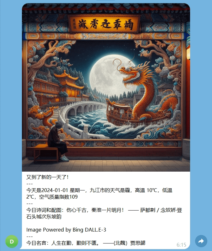 另外,最近在 GitHub 上 Fork 了 XiaowenZ 修改过的项目——daily,主要是利用 GitHub Actions,搭配各类 API,定时生成对应的信息,并发送到 Telegram 频道或群组。我在这个项目里添加了 Bing Create 的 cookie,以及每日诗词的 API,让 Bing Create 以每日诗词的内容为提示词,生成对应的图片,于是便有了下面的效果。