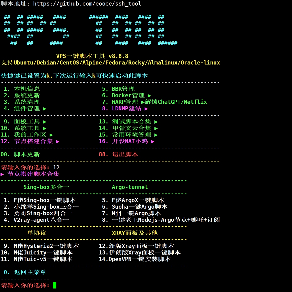 VPS一键脚本工具箱,一个脚本搞定大部分需求,废话不多说,上脚本 curl -fsSL https://raw.githubusercontent.com/eooce/ssh_tool/main/ssh_tool.sh -o ssh_tool.sh && chmod +x ssh_tool.sh && ./ssh_tool.sh 或 wget -qO ssh_tool.sh https://raw.githubusercontent.com/eooce/ssh_tool/main/s…